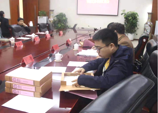 专家组成员听取汇报、查看相关支撑材料