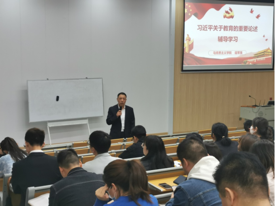 4月27日下午,思想政治教育专业博士研究生寇军强老师为全体新入职教职工做了题为“习近平总书记关于教育重要论述辅导学习”的讲座。他从总书记关于教育的总论开始,介绍了教育的本质、战略、根本任务,同时阐述了总书记在全国教育大会上提出的“九个坚持”理论体系的具体内容。在最后,寇老师为新入职老师提出了几点希望,他鼓励青年教师以德为先,珍惜机遇,敢于迎接挑战,为成为一名合格的大学教师而努力奋斗。