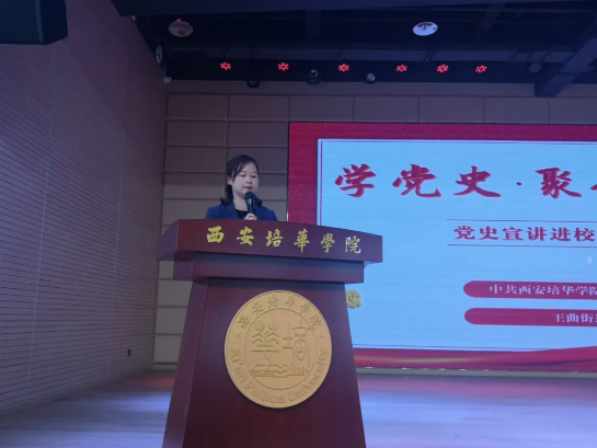 王曲街道光明路社区党员王浩浩、刘诚和人文与国际教育学院学生党员李思琛、方妍为大家讲述党史,重温党的百年风雨征程。