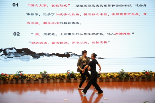 主讲人和学生示范表演 广西花山岩画《祭神舞蹈图》