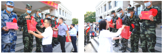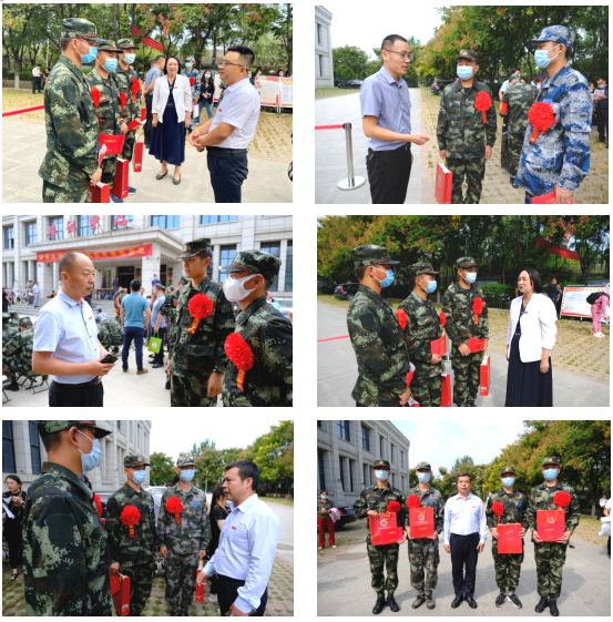 传媒学院党委书记、行政副院长江俊瑞,建筑与艺术设计学院党委书记、行政副院长权勇太,会计与金融学院党委书记、行政副院长史立军,医学院党委副书记何丽,为各自学院的新兵送上入伍纪念品及祝福。