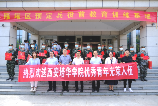 为激发广大师生拥军热情,彰显学校对参军大学生的关心关怀,学校党委学工部(征兵工作站)于9月15日前往雁塔区预定兵役前教育训练基地欢送学校新兵踏上军旅征程,履行保家卫国的光荣义务。党委学工部副部长、征兵工作站站长姚斌,传媒学院党委书记、行政副院长江俊瑞,建筑与艺术设计学院党委书记、行政副院长权勇太,会计与金融学院党委书记、行政副院长史立军,医学院党委副书记何丽,学生服务中心征兵工作干事黄珂参加此次送兵仪式,欢送新兵入伍。