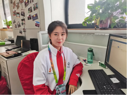 在十四运和残特奥会期间,我负责跳水游泳馆的观众看台服务和组委会的医疗卫生保障服务。在志愿服务期间每天两点一线,穿梭于跳水馆和组委会。在跳水游泳馆领略了国内最高水平游泳运动员的实力,也感受到了观众对于运动的热情。投身志愿服务近五年,非常荣幸有机会参与十四运会和残特奥会志愿服务活动,“小秦宝”的身份也时刻提醒我,要做一个热情善良的人。