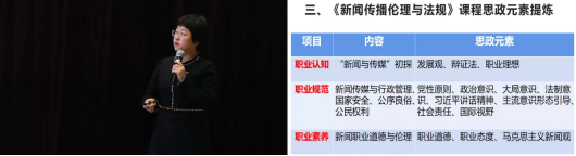 传媒学院新闻传播系陈丽娟就主流意识形态引导下的《新闻传播伦理与法规》课程思政教学与实施进行了分享。陈老师讲到,当下新闻界要培养符合主流意识形态要求,拥有职业热情、职业理想、职业态度与能力的应用型新闻人才,《新闻传播伦理与法规》课程通过案例教学、活动驱动、学科赛事等将职业认知、职业规范、职业素养和发展观、党性原则、政治意识、马克思主义新闻观等内容进行了有机融合。
