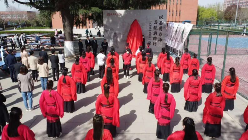 全体师生整齐列于孔子雕像前,向至圣先师行三拜鞠躬礼,表达深深敬意。