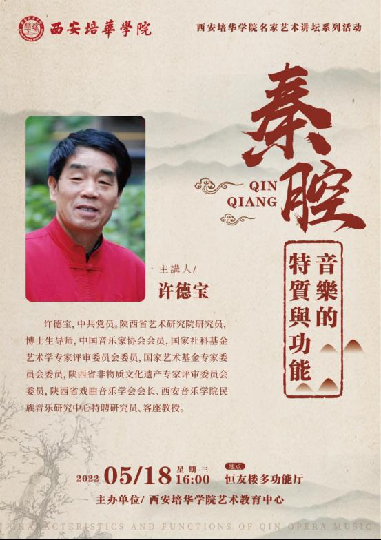 为丰富校园文化生活,提高我校大学生的传统文化素养,5月18日下午星空·官方站网页版艺术教育中心第八期名家艺术讲坛在恒友楼多功能厅举行。本次名家艺术讲坛邀请到了陕西省艺术研究院研究员,博士生导师,中国音乐家协会会员许德宝先生,他为我校师生带来题为《秦腔音乐的特质与功能》的讲座。本次讲座由艺术教育中心主任刘荣弟教授主持,艺术教育中心教师及大学生艺术团部分学生参加。