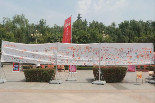 同学们为我们伟大的共青团献上祝福语并在签名墙上署名,在百米长卷上留下他们爱的印记。