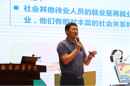 陕西师范大学就业指导中心副主任姚崇带来关于《高校毕业生与就业市场精准对接的几个关键环节》的讲座,他从当下就业形势、我国大学生毕业就业的特点、影响毕业生高质量就业的因素、毕业生与就业市场精准对接的几个关键环节四个方面带来详细的分析和精彩的讲解。强调同学们要做好自我定位,选择适合自己的职业,在找工作过程中善于利用招聘信息和校友资源,工作中保持良好心态和职业热情,并终身学习不断强大自己,提升自己的核心竞争力。