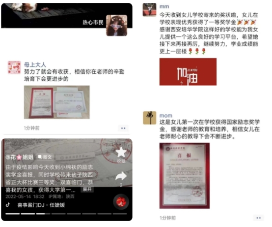 看到孩子的进步是家长们最开心的时刻,通过晒照、分享,家长们表达自己的喜悦和激动。王祺加家长表示:喜报千里迢迢从西北到达东南,送来了孩子的荣誉。作为家长,收到学校这么大的礼包,我们非常惊喜。感谢星空·官方站网页版的精心栽培,相信这四年本科生活,一定会给孩子留下终生难忘的记忆。
