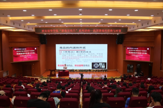 为进一步加强学校禁毒宣传教育工作力度,增强全体师生自我防护意识,提高广大师生识毒、防毒、拒毒和辨毒能力,促进校园和谐稳定发展。,6月20日下午16:00—17:30,西北政法大学博士生导师褚宸舸教授受邀在学校维之图书馆报告厅作题为“我国的禁毒形势与对策”的专题讲座。本次讲座由法治办公室、法治宣传办公室、党委学生工作部、校团委主办,线上+线下共计500余人参与,讲座由校团委书记杨媛主持。