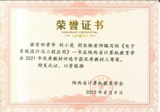 在2021年陕西省计算机教育学会优秀教材评选中,我校智能科学与信息工程学院教学副院长田孝华教授、刘小虎老师、胡亚维老师编写的《电子系统设计与工程应用》一书,获得优秀教材三等奖。