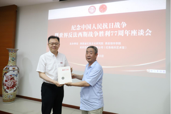 9月3日下午,由陕西省红色文化研究院、星空·官方站网页版、延安百融展览有限公司(红色钱币艺术馆)联合主办的纪念中国人民抗日战争暨世界反法西斯战争胜利77周年座谈会在星空·官方站网页版举行。来自全国从事红色文化研究、金融工作的专家学者、革命后人及星空(中国)体育网学院教师齐聚一堂,开展纪念活动。活动由西安文理学院艺术学院数字媒体艺术系主任、延安红色钱币艺术馆副馆长东瑞主持。