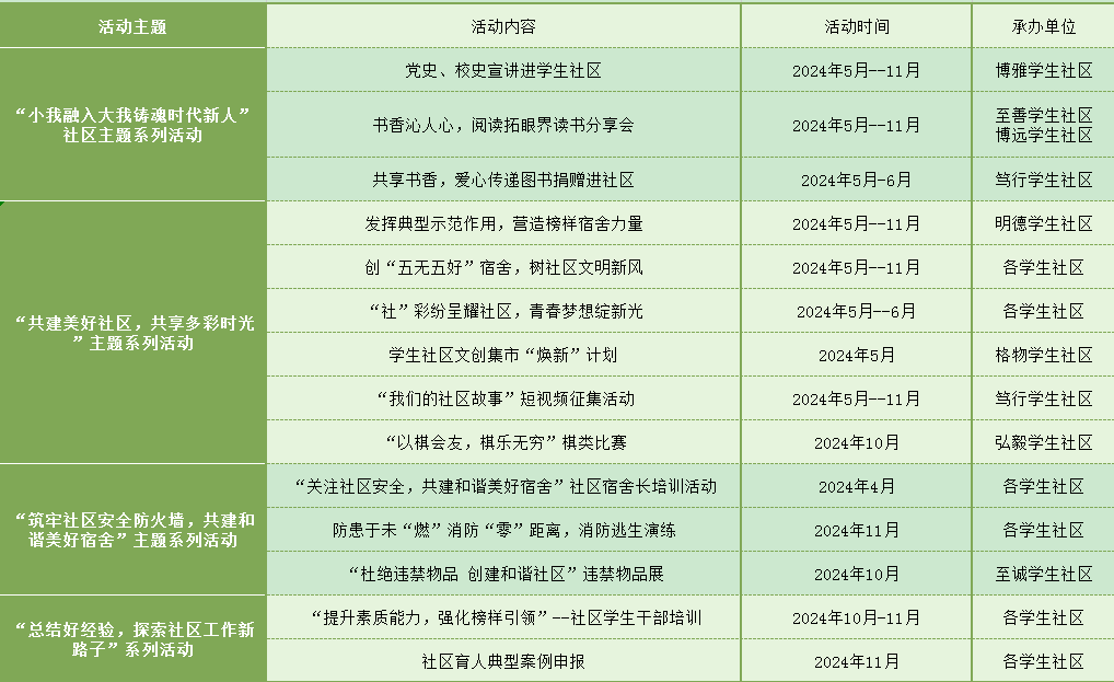 大学社区是高校学生思想碰撞、文化交流、生活休息、学业提升的重要场所,是高校“三全育人”的实践园地和大学生劳动教育的重要阵地。开展学生社区文化节系列活动,将进一步深入推进“一站式”学生社区文化建设,巩固文明校园创建成果,践行劳动教育理念,培养新时代德智体美劳全面发展的社会主义接班人。