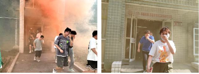 下午16时30分,随着模拟火灾警报的响起,17号公寓楼浓烟滚滚,工作人员广播提醒,各楼层同学们按照疏散路线,迅速有序撤离至楼下安全地带。