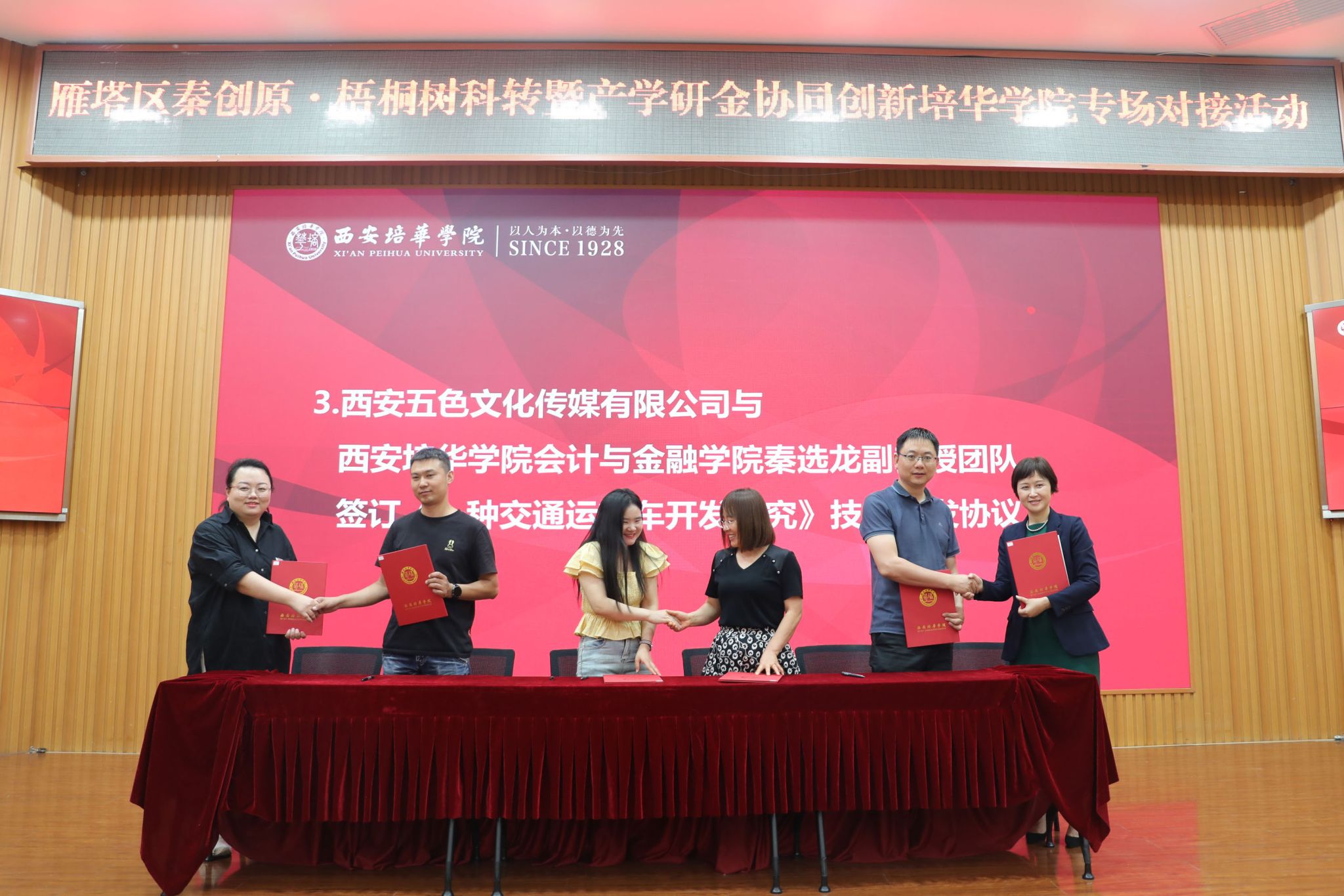学校分别与西安元一撷艺文化传媒有限公司、陕西赛微高科技有限公司、西安五色文化发展有限公司签订《一种可集尘的模型制作工作台》实施许可协议、《基于Component的电子文件归档系统研究》技术开发协议、《一种新型交通运输车研究开发》技术开发协议。