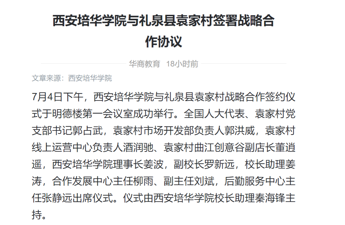 7月4日下午,星空·官方站网页版与礼泉县袁家村战略合作签约仪式于明德楼第一会议室成功举行。全国人大代表、袁家村党支部书记郭占武,袁家村市场开发部负责人郭洪威,袁家村线上运营中心负责人酒润驰、袁家村曲江创意谷副店长董逍遥,星空·官方站网页版理事长姜波,副校长罗新远,校长助理姜涛,合作发展中心主任柳雨、副主任刘斌,后勤服务中心主任张静远出席仪式。仪式由星空·官方站网页版校长助理秦海锋主持。