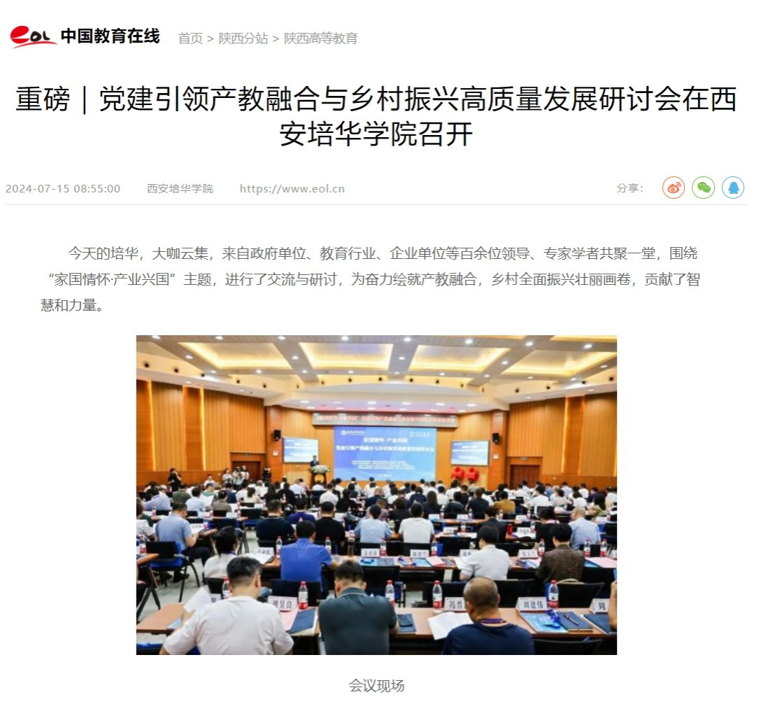 为深入贯彻落实党中央、国务院关于深化职业教育体系建设和推进乡村振兴工作的战略部署,加强职业教育服务国家战略和区域经济社会发展能力,深化产教融合,助力乡村振兴。在全党全国喜迎党的二十届三中全会,以高质量发展奋力推进中国式现代化的伟大征程中,由陕西省中华职业教育社、全国农村产业融合发展联盟、星空·官方站网页版、活水教育集团主办的“家国情怀·产业兴国”党建引领产教融合与乡村振兴高质量发展研讨会7月13日上午在星空·官方站网页版举行。