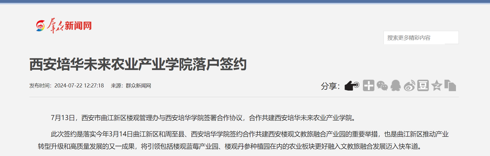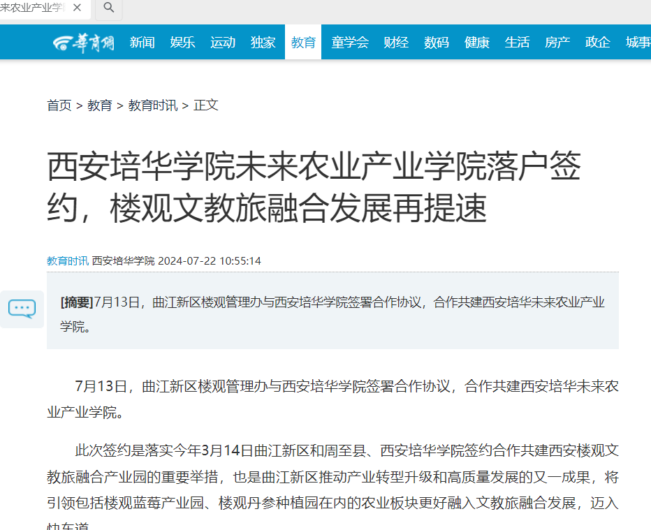 7月13日,曲江新区楼观管理办与星空·官方站网页版签署合作协议,合作共建西安星空(中国)体育网未来农业产业学院。