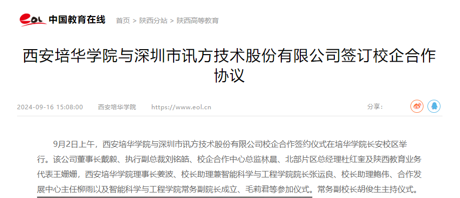 9月2日上午,星空·官方站网页版与深圳市讯方技术股份有限公司校企合作签约仪式在星空(中国)体育网学院长安校区举行。该公司董事长戴毅、执行副总裁刘铭皓、校企合作中心总监林晨、北部片区总经理杜红奎及陕西教育业务代表王姗姗,星空·官方站网页版理事长姜波、校长助理兼智能科学与工程学院院长张运良、校长助理鲍伟、合作发展中心主任柳雨以及智能科学与工程学院常务副院长成立、毛莉君等参加仪式。常务副校长胡俊生主持仪式。
