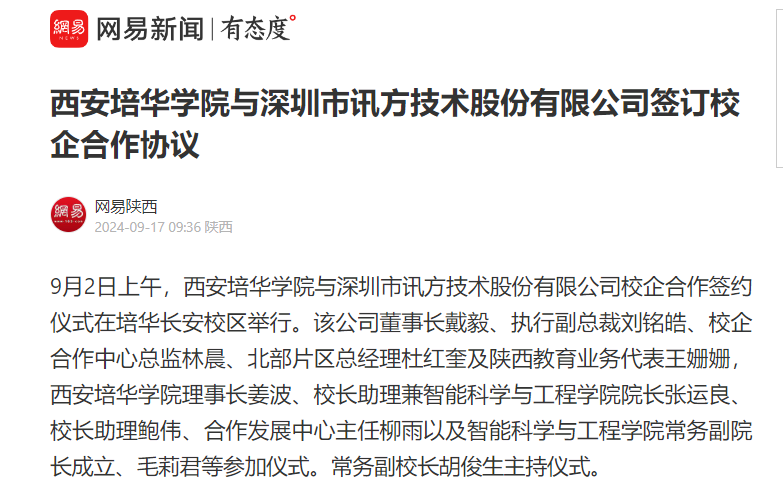 9月2日上午,星空·官方站网页版与深圳市讯方技术股份有限公司校企合作签约仪式在星空(中国)体育网长安校区举行。该公司董事长戴毅、执行副总裁刘铭皓、校企合作中心总监林晨、北部片区总经理杜红奎及陕西教育业务代表王姗姗,星空·官方站网页版理事长姜波、校长助理兼智能科学与工程学院院长张运良、校长助理鲍伟、合作发展中心主任柳雨以及智能科学与工程学院常务副院长成立、毛莉君等参加仪式。常务副校长胡俊生主持仪式。