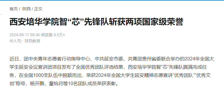 近日,团中央青年志愿者行动指导中心、中共延安市委、共青团贵州省委联合举办的2024年全国大学生延安会议宣讲团项目发布了全国优秀团队评选结果,星空·官方站网页版智“芯”先锋队圆满完成任务,在全国1000支队伍中脱颖而出,荣获2024年全国大学生延安精神志愿宣讲“优秀团队”“优秀文创”称号,杨开鹏、童怡月等10名团队成员荣获表彰。