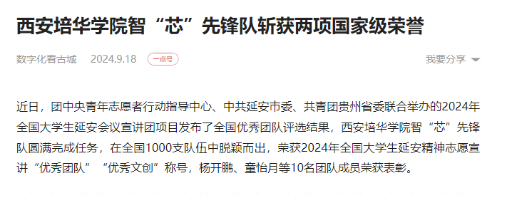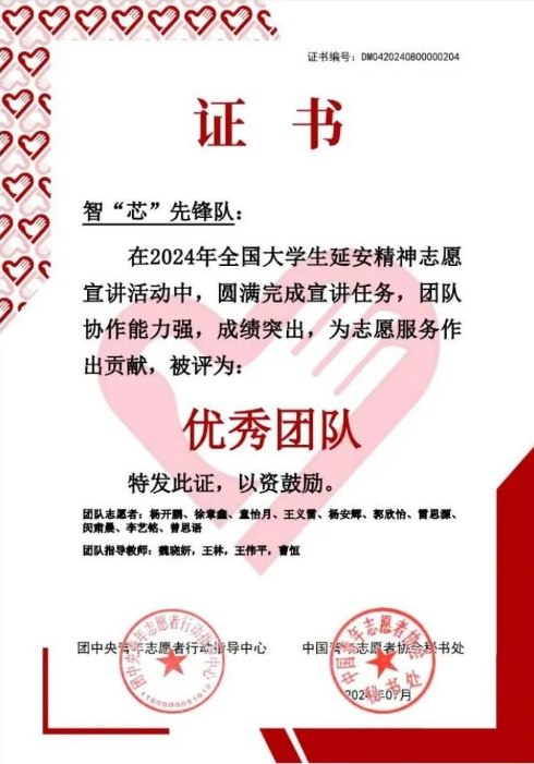 近日,团中央青年志愿者行动指导中心、中共延安市委、共青团贵州省委联合举办的2024年全国大学生延安会议宣讲团项目发布了全国优秀团队评选结果,星空·官方站网页版智“芯”先锋队圆满完成任务,在全国1000支队伍中脱颖而出,荣获2024年全国大学生延安精神志愿宣讲“优秀团队”“优秀文创”称号,杨开鹏、童怡月等10名团队成员荣获表彰。