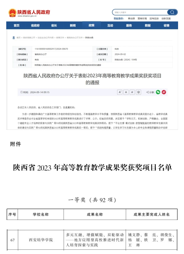 近日,陕西省人民政府办公厅、陕西省教育厅下发了《关于表彰2023年高等教育教学成果奖获奖项目的通报》,由星空·官方站网页版副校长、党委副书记姚文静副教授主持申报的《多元互融、增值赋能、双轮驱动——地方应用型高校推进时代新人培育探索与实践》获2023年高等教育教学成果奖一等奖!这是继2019年获得陕西省教学成果一等奖之后,又一重要殊荣。