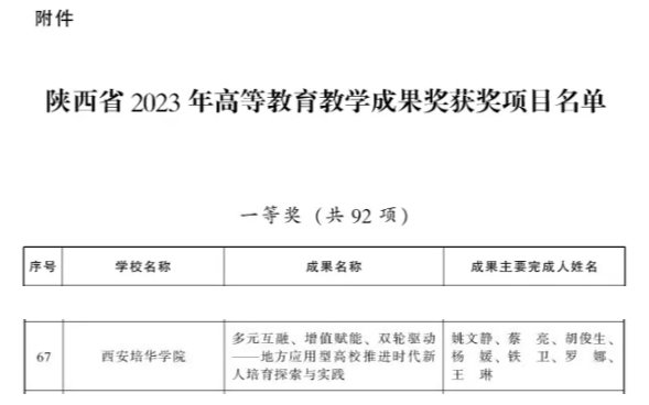 近日,陕西省人民政府办公厅、陕西省教育厅下发了《关于表彰2023年高等教育教学成果奖获奖项目的通报》,由星空·官方站网页版副校长、党委副书记姚文静副教授主持申报的《多元互融、增值赋能、双轮驱动——地方应用型高校推进时代新人培育探索与实践》获2023年高等教育教学成果奖一等奖!这是继2019年获得陕西省教学成果一等奖之后,又一重要殊荣。