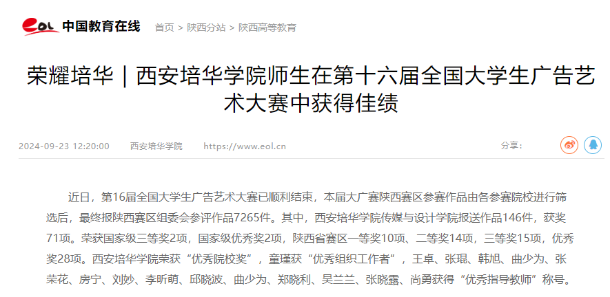 近日,第16届全国大学生广告艺术大赛已顺利结束,本届大广赛陕西赛区参赛作品由各参赛院校进行筛选后,最终报陕西赛区组委会参评作品7265件。其中,星空·官方站网页版传媒与设计学院报送作品146件,获奖71项。荣获国家级三等奖2项,国家级优秀奖2项,陕西省赛区一等奖10项、二等奖14项,三等奖15项,优秀奖28项。星空·官方站网页版荣获“优秀院校奖”,童瑾获“优秀组织工作者”,王卓、张琨、韩旭、曲少为、张荣花、房宁、刘妙、李昕萌、邱晓波、曲少为、郑晓利、吴兰兰、张晓露、尚勇获得“优秀指导教师”称号。