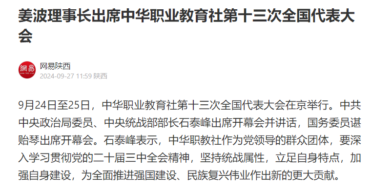 9月24日至25日,中华职业教育社第十三次全国代表大会在京举行。中共中央政治局委员、中央统战部部长石泰峰出席开幕会并讲话,国务委员谌贻琴出席开幕会。石泰峰表示,中华职教社作为党领导的群众团体,要深入学习贯彻党的二十届三中全会精神,坚持统战属性,立足自身特点,加强自身建设,为全面推进强国建设、民族复兴伟业作出新的更大贡献。