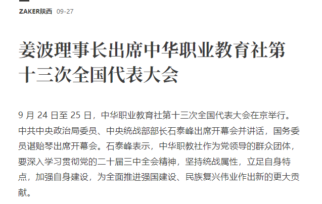 9 月 24 日至 25 日,中华职业教育社第十三次全国代表大会在京举行。中共中央政治局委员、中央统战部部长石泰峰出席开幕会并讲话,国务委员谌贻琴出席开幕会。石泰峰表示,中华职教社作为党领导的群众团体,要深入学习贯彻党的二十届三中全会精神,坚持统战属性,立足自身特点,加强自身建设,为全面推进强国建设、民族复兴伟业作出新的更大贡献。
