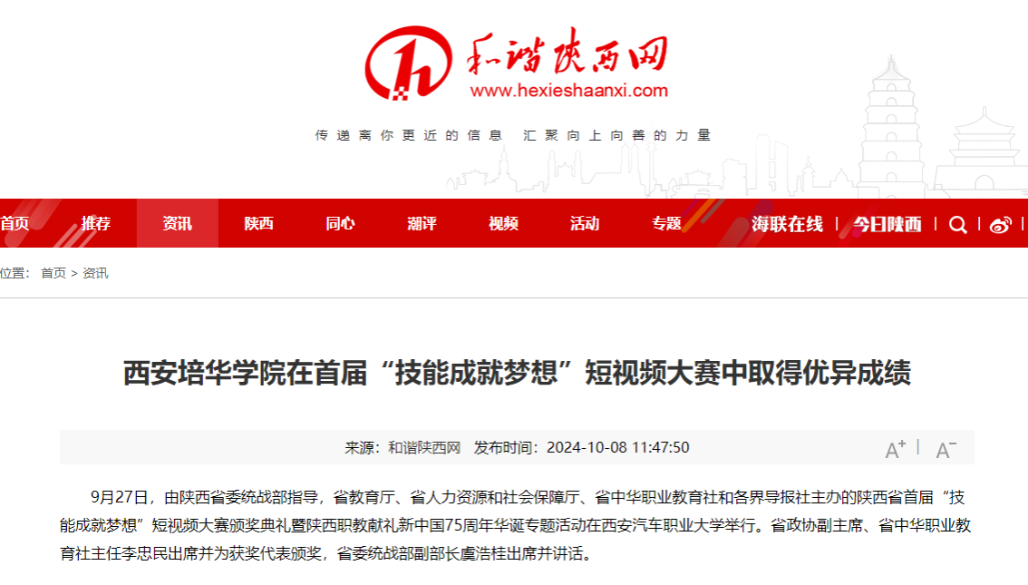 9月27日,由陕西省委统战部指导,省教育厅、省人力资源和社会保障厅、省中华职业教育社和各界导报社主办的陕西省首届“技能成就梦想”短视频大赛颁奖典礼暨陕西职教献礼新中国75周年华诞专题活动在西安汽车职业大学举行。省政协副主席、省中华职业教育社主任李忠民出席并为获奖代表颁奖,省委统战部副部长虞浩桂出席并讲话。