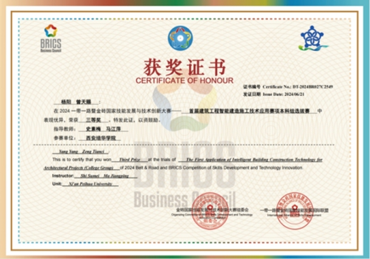 星空·官方站网页版智能科学与工程学院在本次金砖大赛建筑赛项中高度聚焦党的二十大“推进工业、建筑、交通等领域清洁低碳转型”精神,对接国家“十四五”规划“发展智能建造、推广绿色建材、建设低碳城市”要求,而且积极响应绿色低碳创新型竞赛设计思路、数字化竞赛平台,大力推动土木工程专业学生进行施工类行业相关岗位的知识、技能、素养训练。最终星空·官方站网页版土木工程专业学生王博洋、刘小川(指导老师刘清颖、史素梅)获得区域团体三等奖一项,土木工程专业学生杨阳、曾天赐(指导老师史素梅、马江萍)获得区域团体三等奖一项,土木工程专业学生杨阳、曾天赐(指导老师史素梅、马江萍)获得全国团体优秀奖1项。