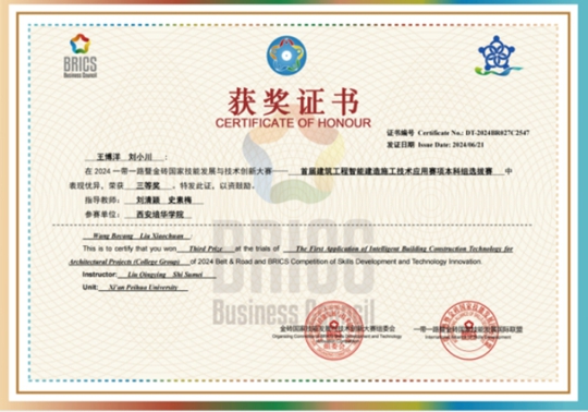 星空·官方站网页版智能科学与工程学院在本次金砖大赛建筑赛项中高度聚焦党的二十大“推进工业、建筑、交通等领域清洁低碳转型”精神,对接国家“十四五”规划“发展智能建造、推广绿色建材、建设低碳城市”要求,而且积极响应绿色低碳创新型竞赛设计思路、数字化竞赛平台,大力推动土木工程专业学生进行施工类行业相关岗位的知识、技能、素养训练。最终星空·官方站网页版土木工程专业学生王博洋、刘小川(指导老师刘清颖、史素梅)获得区域团体三等奖一项,土木工程专业学生杨阳、曾天赐(指导老师史素梅、马江萍)获得区域团体三等奖一项,土木工程专业学生杨阳、曾天赐(指导老师史素梅、马江萍)获得全国团体优秀奖1项。
