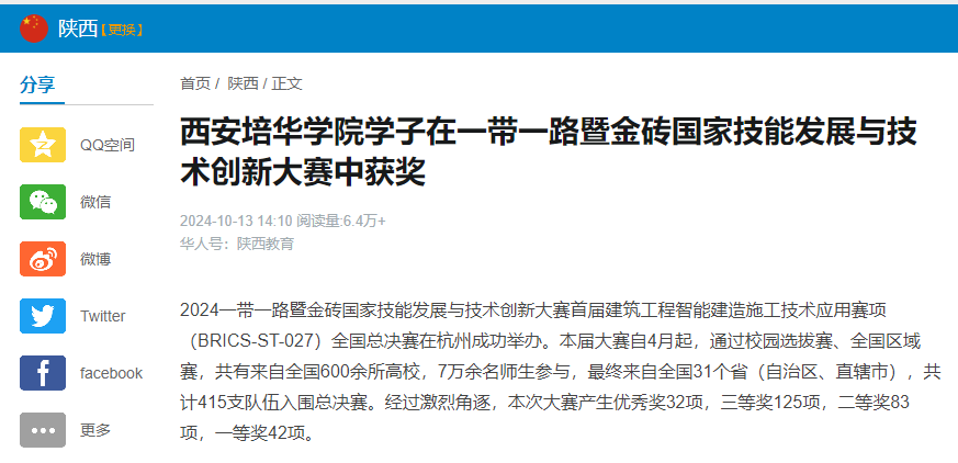 2024一带一路暨金砖国家技能发展与技术创新大赛首届建筑工程智能建造施工技术应用赛项(BRICS-ST-027)全国总决赛在杭州成功举办。本届大赛自4月起,通过校园选拔赛、全国区域赛,共有来自全国600余所高校,7万余名师生参与,最终来自全国31个省(自治区、直辖市),共计415支队伍入围总决赛。经过激烈角逐,本次大赛产生优秀奖32项,三等奖125项,二等奖83项,一等奖42项。