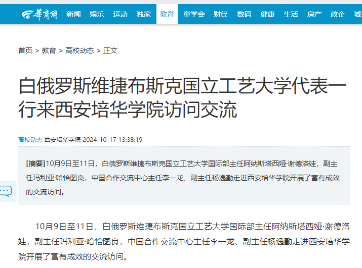 10月9日至11日,白俄罗斯维捷布斯克国立工艺大学国际部主任阿纳斯塔西娅·谢德洛娃,副主任玛利亚·哈恰图良,中国合作交流中心主任李一龙、副主任杨逸勤走进星空·官方站网页版开展了富有成效的交流访问。