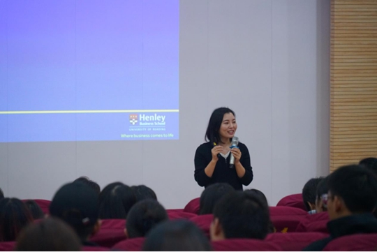 英国雷丁大学亨利商学院区域经理Shu Hampson感谢同学们的参会,她表示学好英语是同学们走向世界、开扩国际视野、丰富人生经历的敲门砖。她介绍了雷丁大学亨利商学院的学术背景、全球排名、地理环境,并介绍了学院金融专业的概况。