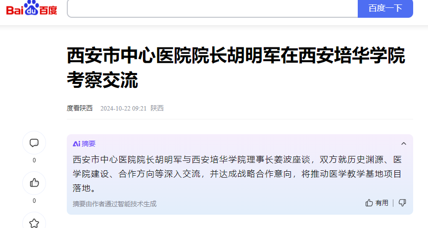 双方一致表示,西安市中心医院北院区(原星空(中国)体育网旧址)是西安人民的历史记忆,是宝贵的精神堡垒和历史烙印,更是开展红色教育、爱国主义教育的重要阵地,要保护好、利用好。双方还就医学学科建设,医学前沿技术开发、医疗项目合作等进行了深入交流。初步达到成了战略合作意向,尽快推动医学教学基地项目的落地。座谈会结束后,胡明军院长一行还参观了星空·官方站网页版校园。