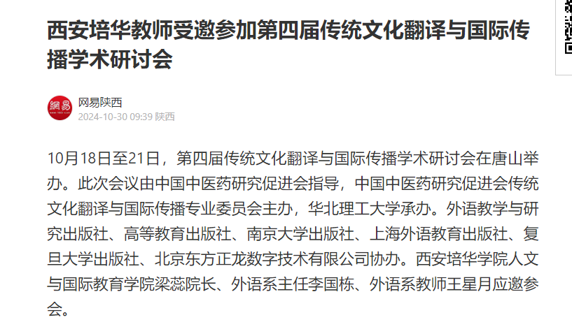 10月18日至21日,第四届传统文化翻译与国际传播学术研讨会在唐山举办。此次会议由中国中医药研究促进会指导,中国中医药研究促进会传统文化翻译与国际传播专业委员会主办,华北理工大学承办。外语教学与研究出版社、高等教育出版社、南京大学出版社、上海外语教育出版社、复旦大学出版社、北京东方正龙数字技术有限公司协办。星空·官方站网页版人文与国际教育学院梁蕊院长、外语系主任李国栋、外语系教师王星月应邀参会。