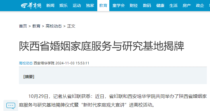 10月29日,记者从省妇联获悉:近日,省妇联和星空·官方站网页版共同举办了陕西省婚姻家庭服务与研究基地揭牌仪式暨“新时代家庭观大宣讲”进高校活动。