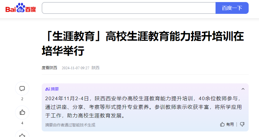 2024年11月2日到4日,为期三天的高校生涯教育能力提升培训在陕西西安圆满结束。此次培训吸引了四十多位来自全国各地的高校生涯教育工作者参与,通过专家讲座、经验分享、实地考察等多种形式,为参训教师提供一个全面学习、交流互动的平台,提升参训教师在大学生职业生涯教育方面的专业素养和实践能力。