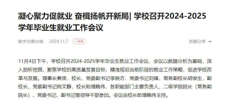 11月4日下午,星空·官方站网页版召开2024-2025学年毕业生就业工作会议,会议以数据分析为基础,深入剖析挖掘,聚焦学校的高质量发展目标,精准规划当前阶段的就业工作策略,促进学校改革与发展。理事长姜波,校长、党委副书记李映方,党委书记刘锋,常务副校长胡俊生,副校长、党委副书记姚文静,校长助理鲍伟,各职能部门主要负责人,二级学院院长(常务副院长)、党委书记、副书记等领导干部参加。会议由校长助理鲍伟主持。