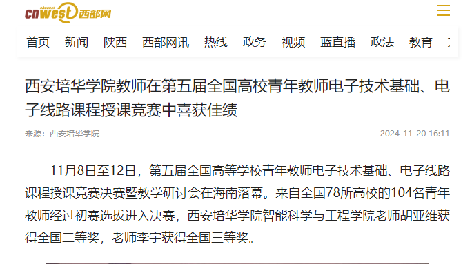 本次大赛旨在提升青年教师电子技术基础与电子线路课程的教学水平,推动课程体系的改革与创新,进一步激发教师投入课程建设和教学研究的热情。开赛以来,学校高度重视备赛工作,积极组织专家围绕参赛内容进行研讨打磨,参赛教师认真备赛、团结协作、相互借鉴,不断完善授课作品,最终凭借扎实的教学基本功、先进的教育理念和创新的教学方法,获得大赛评委的一致好评,荣获全国二等奖、三等奖。