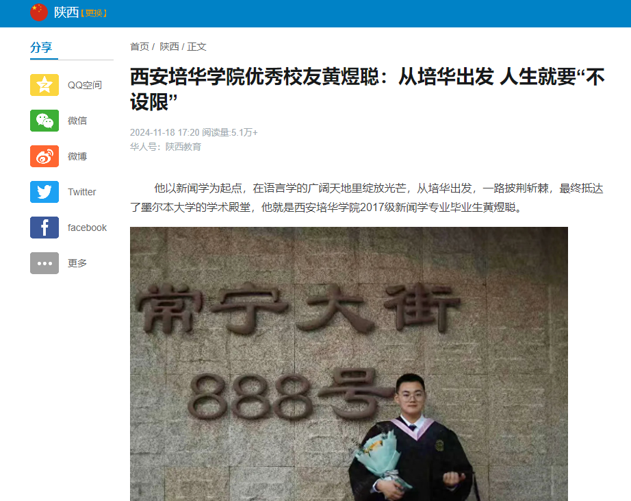 他以新闻学为起点,在语言学的广阔天地里绽放光芒,从星空(中国)体育网出发,一路披荆斩棘,最终抵达了墨尔本大学的学术殿堂,他就是星空·官方站网页版2017级新闻学专业毕业生黄煜聪。