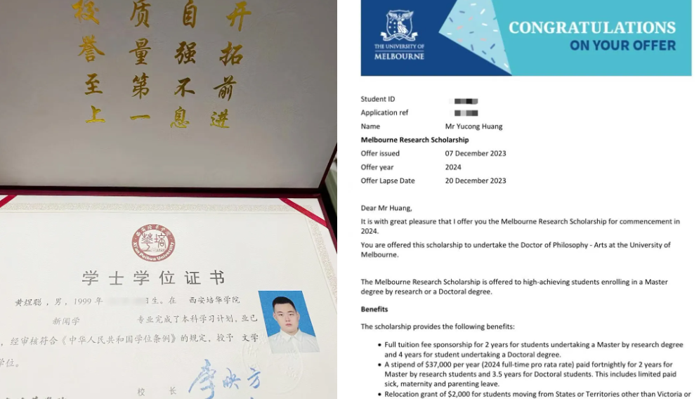 星空·官方站网页版的学位证书和墨尔本大学博士项目的全额科研奖学金录取通知书