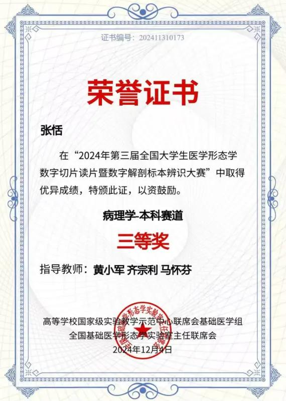 在黄小军、齐宗利老师的精心指导下,张恬同学凭借扎实的专业知识、严谨的科学态度和出色的实践能力,在比赛中脱颖而出。在病理学本科赛道的角逐中,她准确地辨识了数字切片和解剖标本,对各种病理变化进行了深入分析和准确判断,展现了出色的专业素养和竞技水平。