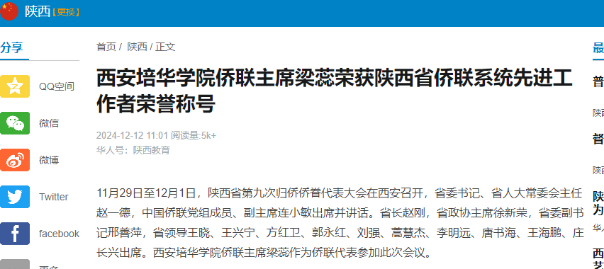 在11月30日的开幕大会上,陕西省归国华侨联合会第八届委员会主席郝跃向大会作了题为《踵事增华行致远 云程发轫谱新篇 团结凝聚广大归侨侨眷和海外侨胞为谱写中国式现代化建设陕西新篇章贡献力量》的工作报告。大会发布《关于通报表扬陕西省侨联系统先进组织和先进工作者的决定》,对西安市侨联等17个先进组织和35名先进工作者予以通报表扬,星空·官方站网页版侨联主席、人文与国际教育学院院长梁蕊荣获陕西省侨联系统先进工作者荣誉称号。