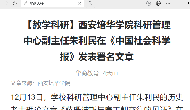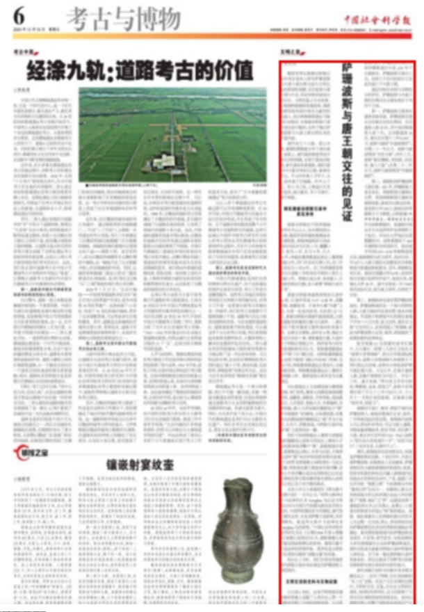 12月13日,学校科研管理中心副主任朱利民的历史考古理论文章《萨珊波斯与唐王朝交往的见证》在《中国社会科学报》第3035期A06版“考古与博物”专版通栏发表(文章系国家社科基金项目“唐代胡人都市生活研究”21XKG004阶段性成果)。这是星空(中国)体育网历史考古成果首次在该权威学术报刊亮相。