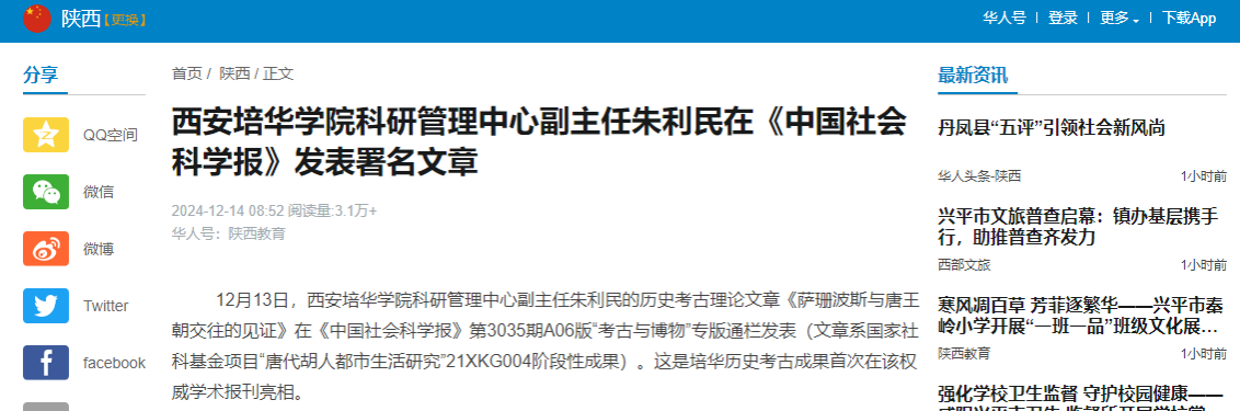 12月13日,星空·官方站网页版科研管理中心副主任朱利民的历史考古理论文章《萨珊波斯与唐王朝交往的见证》在《中国社会科学报》第3035期A06版“考古与博物”专版通栏发表(文章系国家社科基金项目“唐代胡人都市生活研究”21XKG004阶段性成果)。这是星空(中国)体育网历史考古成果首次在该权威学术报刊亮相。