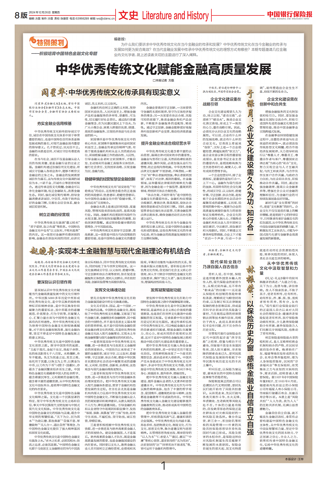 文化关乎国本、国运,是一个国家、一个民族的灵魂。中国特色金融文化,既吸收了中华优秀传统文化精髓,又彰显了现代金融元素、金融理念和金融精神,其中蕴含的中国特色,并不是马克思主义基本理论的简单移植,也不是中国传统金融经营和金融治理文化的再现,而是将优秀传统金融文化注入现代金融理论,实现本土传统金融智慧与现代金融理论的有机结合。